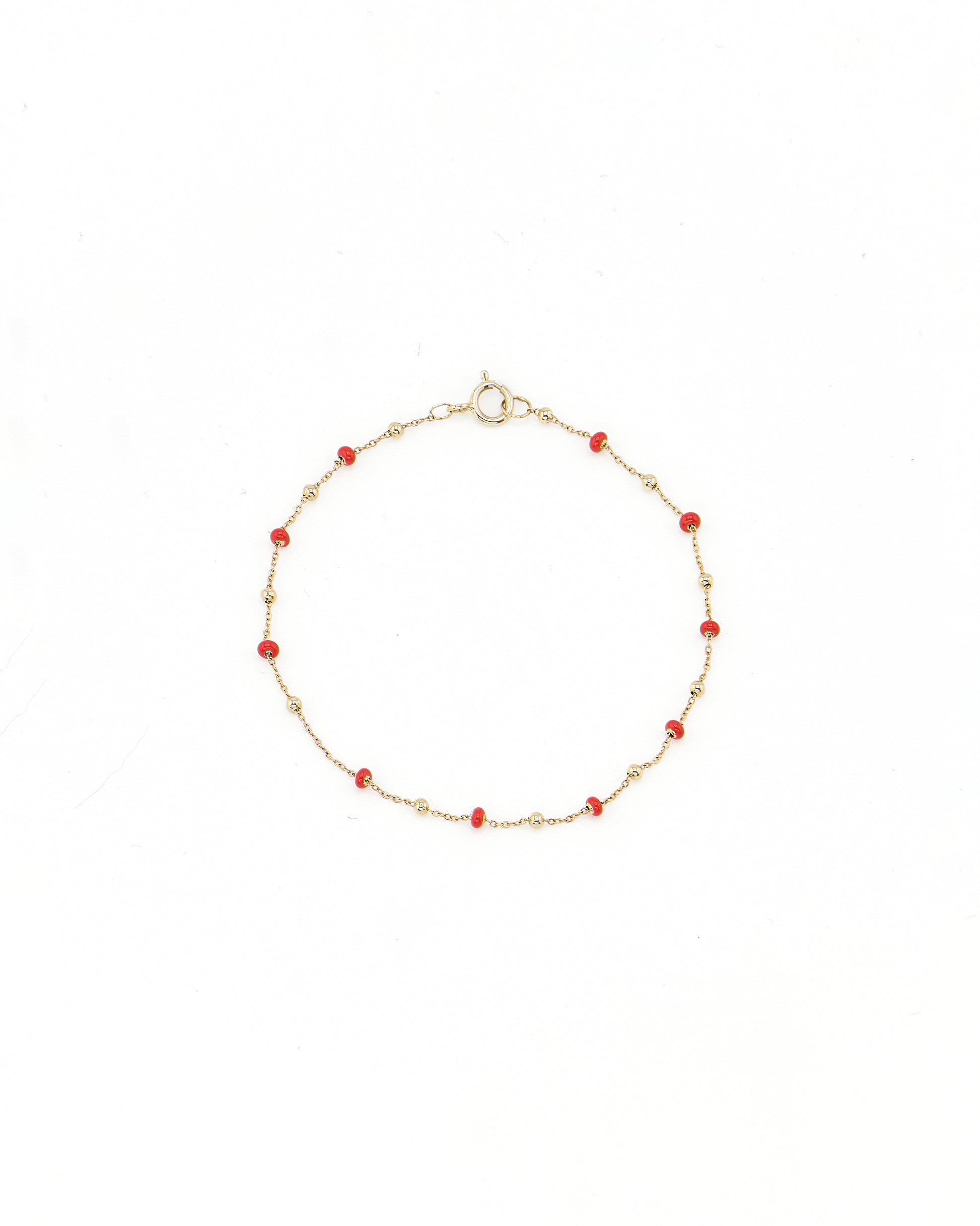 This gold bracelet features alternating coloured beads and gold beads delicately set along the chain. The combination of vibrant colour and warm gold creates a playful yet elegant look.